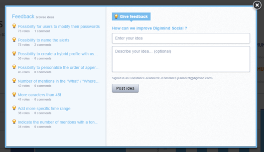 Our Digimind Social Suggestion box is a discrete pop-up that allows our users to submit comments and improvements for the tool. This collaborative option invites users to share their experiences and to identify evolutions within the software. With the suggestion box, our goal is to create a real user community, where everyone can vote for the suggestion more pertinents.